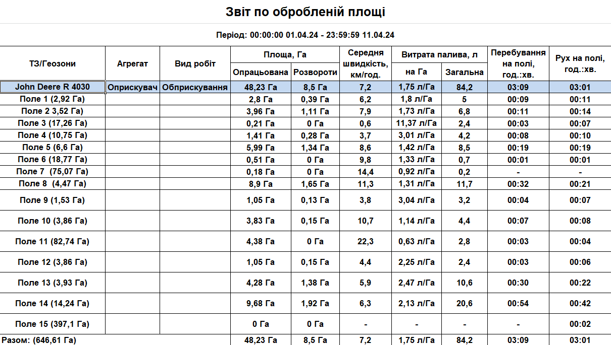 Розрахунок польової продуктивності – обчислення обробленої площі поля, розворотів, повторних наїздів, витрати пального на гектар, час роботи у конкретному полі.